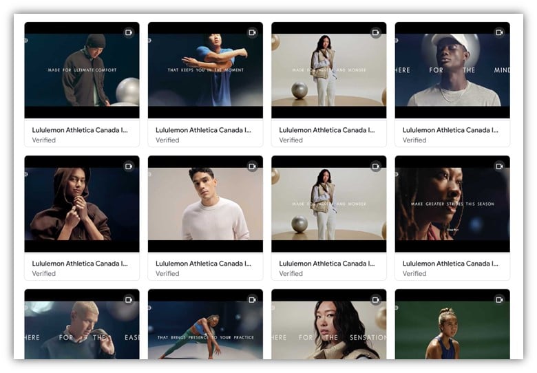 接下来,我很好奇 Lululemon 是否利用视频作为其 Google Ads 策略的一部分,因此我打开了视频过滤器,瞧!他们当前的品牌活动中的每个视频都在那里,我可以点击其中任何一个来观看灵感。